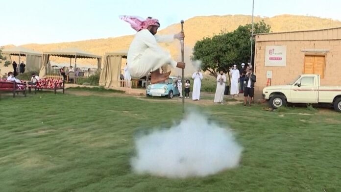 The art of Taachir is known to be a traditional dance for the people of Taif, west of Saudi Arabia. Itβs known as an ancient war dance performed by carrying a weapon stuffed with gunpowder, which turns into a flame under the feet of the performer as he dances. The people of Taif preserve this traditional dance to try and keep it alive for future generations.