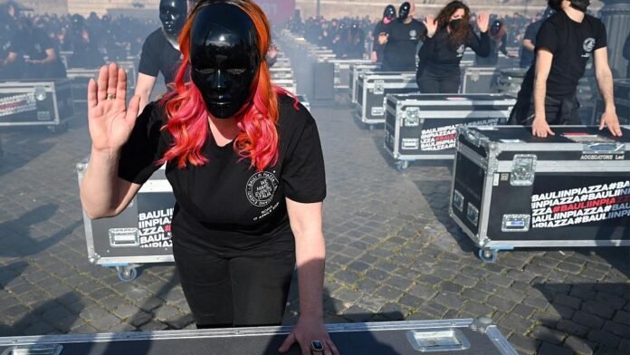 Hundreds of showbiz workers gathered in the centre of Rome to protest against the coronavirus lockdowns that have closed the curtains of theatres, cinemas and live music.