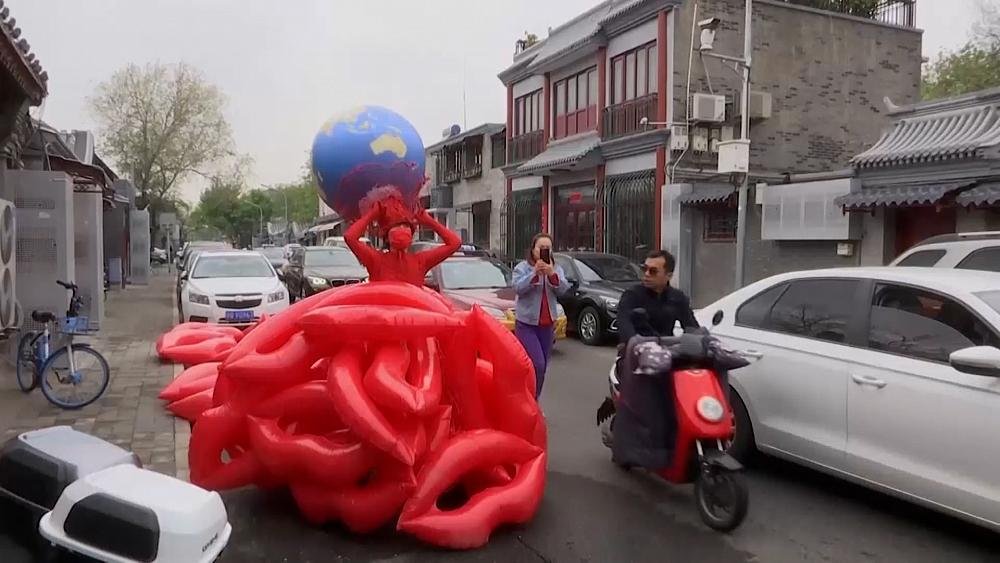 Standing in a grey-brick alley in central Beijing, Kong wears a crown in the shape of a globe, with 40 inflatable red lips fitted on a wire structure that trails behind her like a wedding gown train.