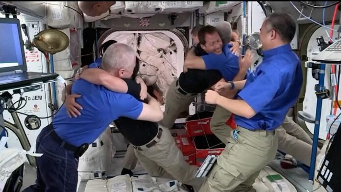 Four astronauts who lifted off from Earth on Friday docked at the International Space Station.