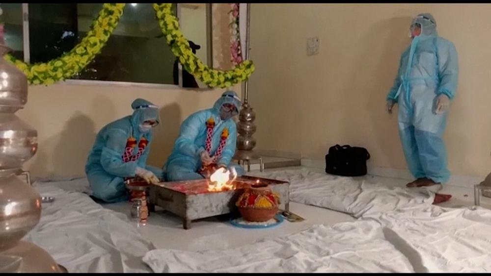 The bride and the groom and rest of the family members wore PPE (personal protective equipment) kits as a priest also in PPE recited sacred verses and performed the wedding rituals on Monday.