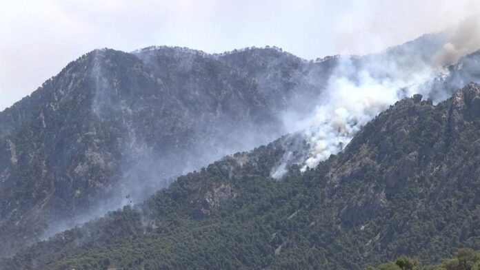 A large wildfire in Greece damaged homes and prompted evacuations on Thursday as it tore through rugged forest terrain.