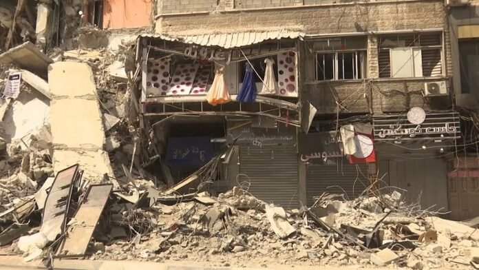 Omar al-Mukhatar street, lined with clothes and food shops, was covered in debris, smashed cars and twisted metal after a towering 13-floor building in its center was flattened in an Israeli airstrike.