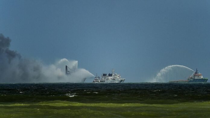 Ships spray water at a container ship off Sri Lanka’s coast as an international firefighting effort to put out a huge blaze carries on. The vessel was carrying nearly 1,500 containers, including 25 tonnes of nitric acid, when a fire broke out more than a week ago as it waited to enter Colombo port