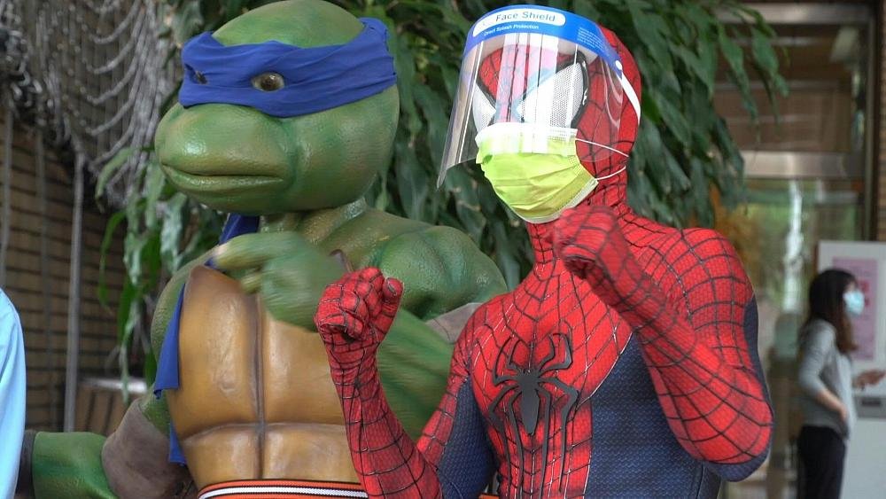 A Taiwan restaurateur and his friends dress up as spiderman and ninja turtle while they deliver donations of lunch boxes to frontline medical staff, in an effort to put a smile on the island’s healthcare workers as they deal with a sudden surge of infections.