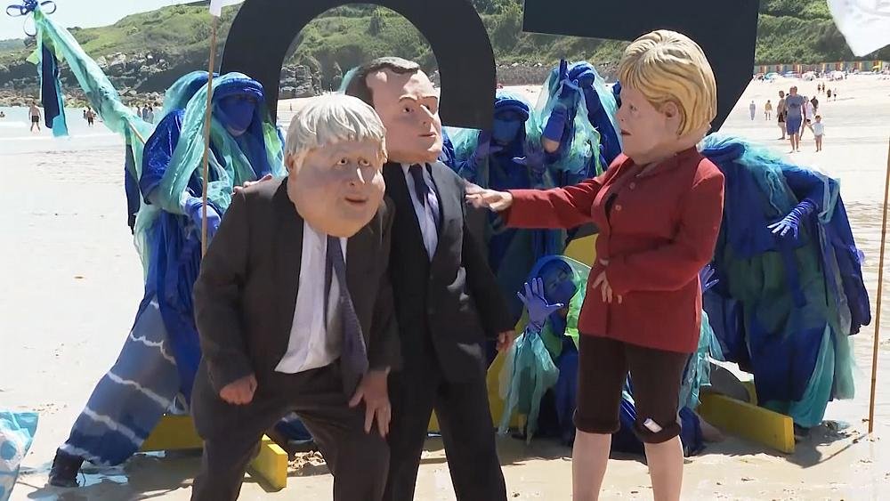 The “All Hands On Deck” protest, which involved hundreds of activists, was held close to where the summit was being held in Carbis Bay on the southwestern tip of England.