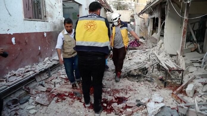 The Syrian Observatory for Human Rights said a doctor, three hospital staff, two women and two children died at Al-Shifaa hospital in the city which is held by Turkish-backed rebels.