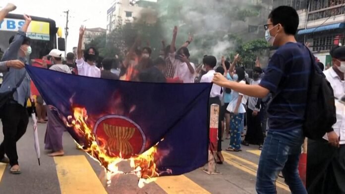 HomeUncategorizedMyanmar: Protesters burn ASEAN flag