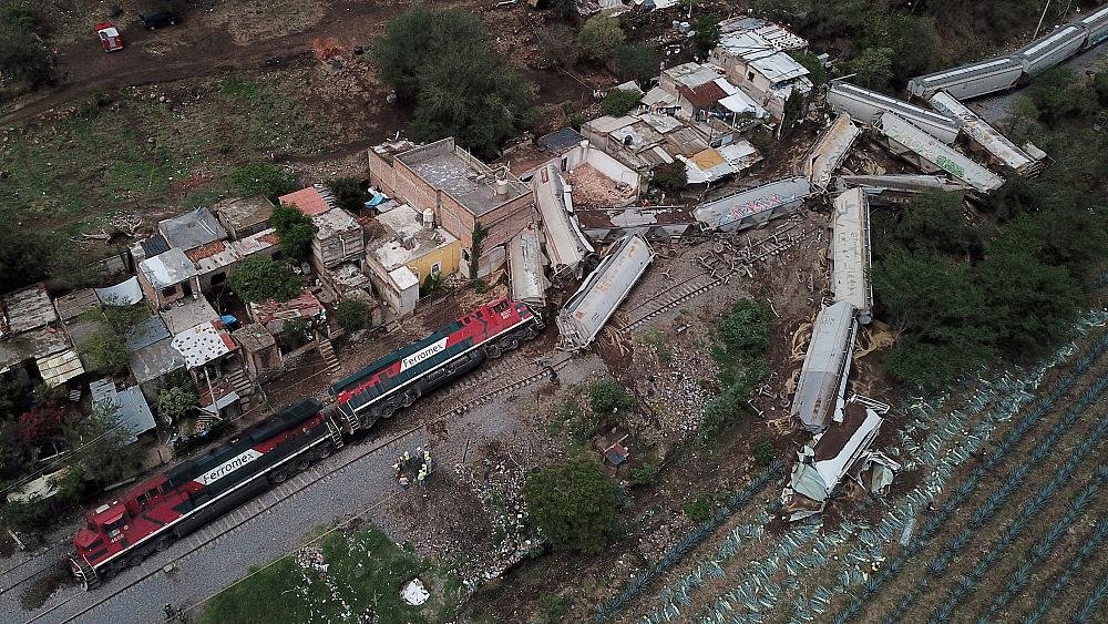 A freight train has derailed and toppled onto houses alongside the tracks in western Mexico, killing one resident and injuring three others. Two locomotives and 12 train cars overturned in the town of San Isidro Mazatepec in the state of Jalisco, the region’s civil protection and fire department said on Twitter.