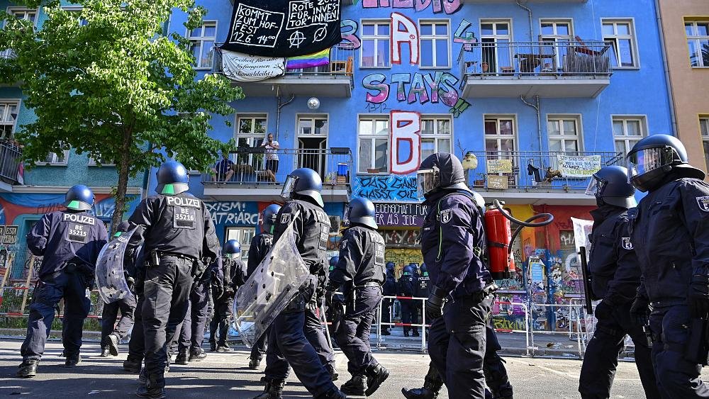 But as officers arrived to secure the area ahead of the inspection, they were met with stones and firecrackers being thrown at them from rooftops and the street. Police said 60 officers were injured when they responded to burning barricades set up outside the premises in east Berlin’s Friedrichshain neighbourhood. Several arrests were reported.