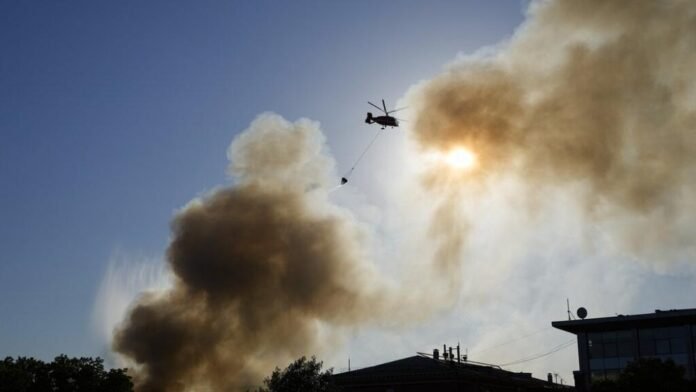 At least two helicopters were being used to empty buckets of water on the flames from above.