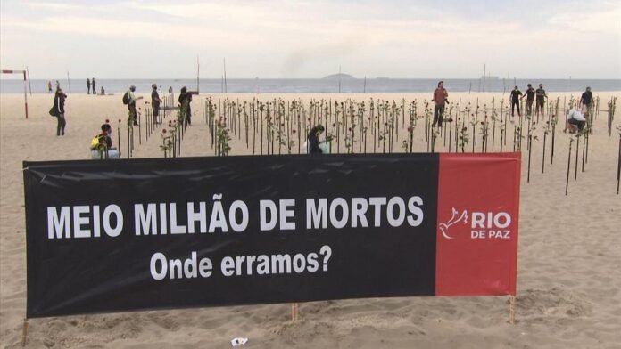 Activists set 500 red roses on Rio de Janeiro’s Copacabana Beach on Sunday, commemorating the deaths of 500,000 Brazilians from COVID-19 as Brazil passed the devastating milestone.