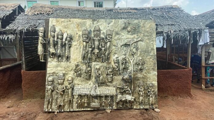 His 6 foot by 6 foot bronze plaque has makings showing historic occasions in Benin City.