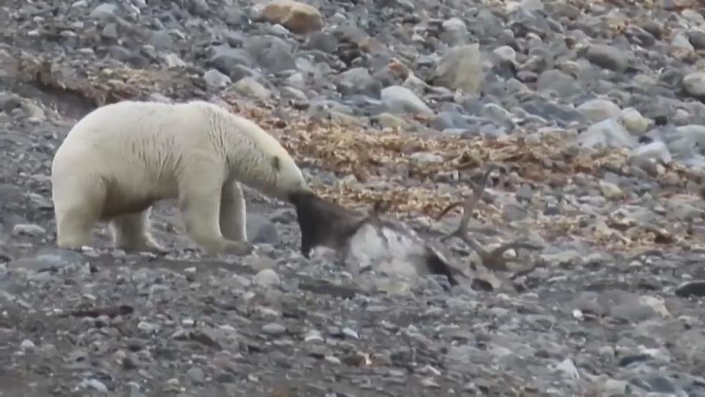 After the women polar bear sinks the male target, she drags it onto land in an action that shows an adjustment of diet plan for bears in Norway” s Svalbard island chain.